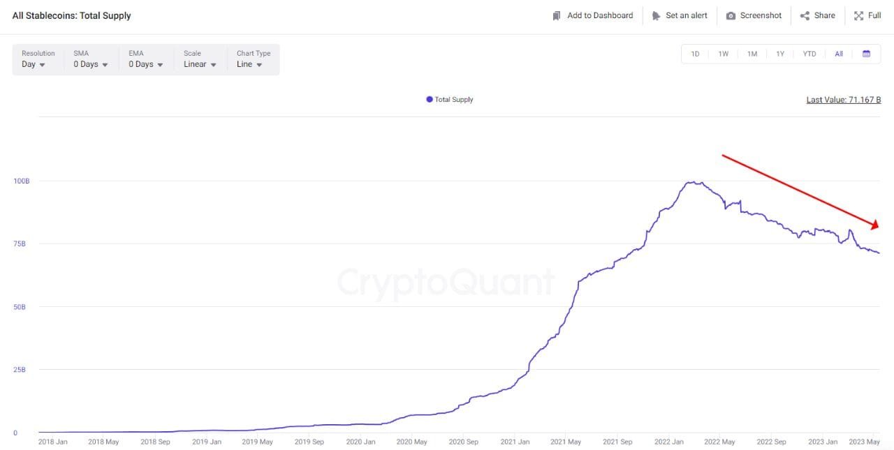 The demand for stablecoins has declined since February 2022 — the supply has dropped $99 billion to $71.1 billion now. That coincides with the dip in Bitcoin prices, which dropped 50% in the same timeframe.