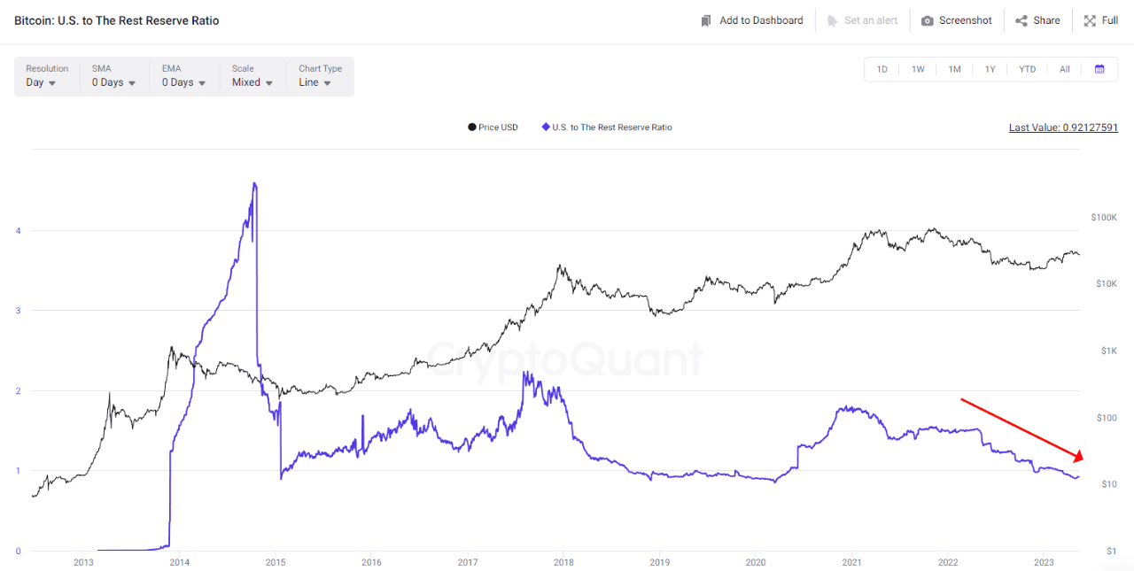 In detail, the platform’s US to The Rest Reserve Ratio, which reflects “US entities (exchanges, banks, funds) [Bitcoin] supply divided by the rest,” has declined in recent months, suggesting that they have moved their capital to global centralized and decentralized exchanges.