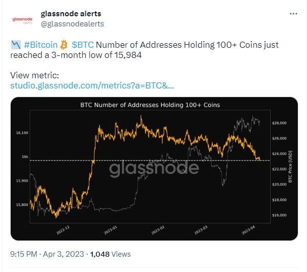 According to another analytical platform Glassnode, the number of Bitcoin whales, i.e., addresses holding over 100 BTC, has reached a three-month low of just below 16,000 wallets.