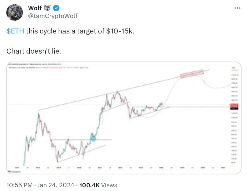 I am Crypto Wolf’s post about Ethereum’s price reaching $15,000 in 2024. Source: X