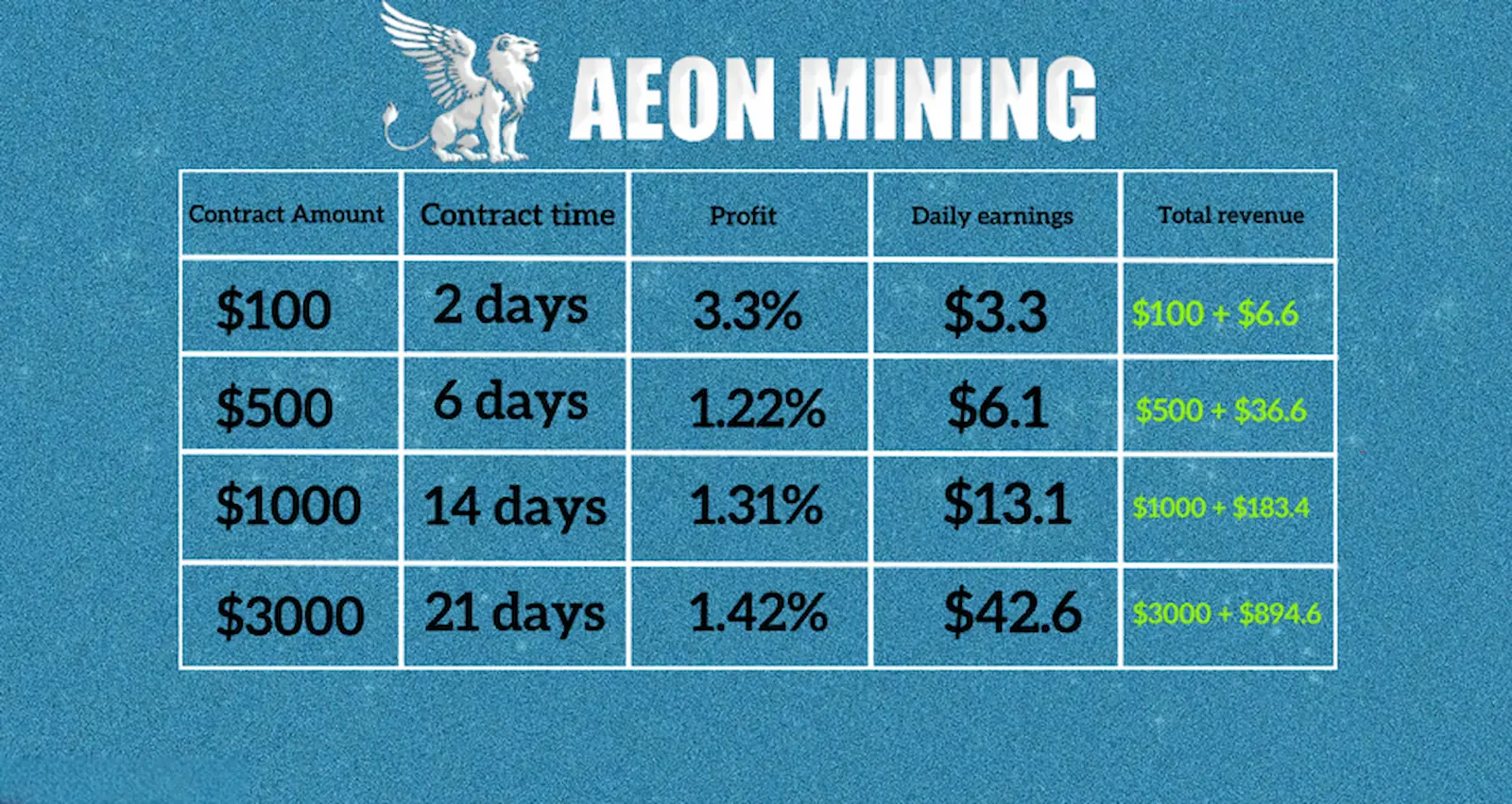 AEON MINING is the world’s leading cloud mining platform with a clear mission: to provide you with the tools and services you need to succeed in the digital asset space. Powering the future of finance with clean energy and providing the high-performance equipment needed to achieve maximum hashing power, AEON MINING promises to bring you a profitable crypto journey. Official website:https://aeonmining.com/