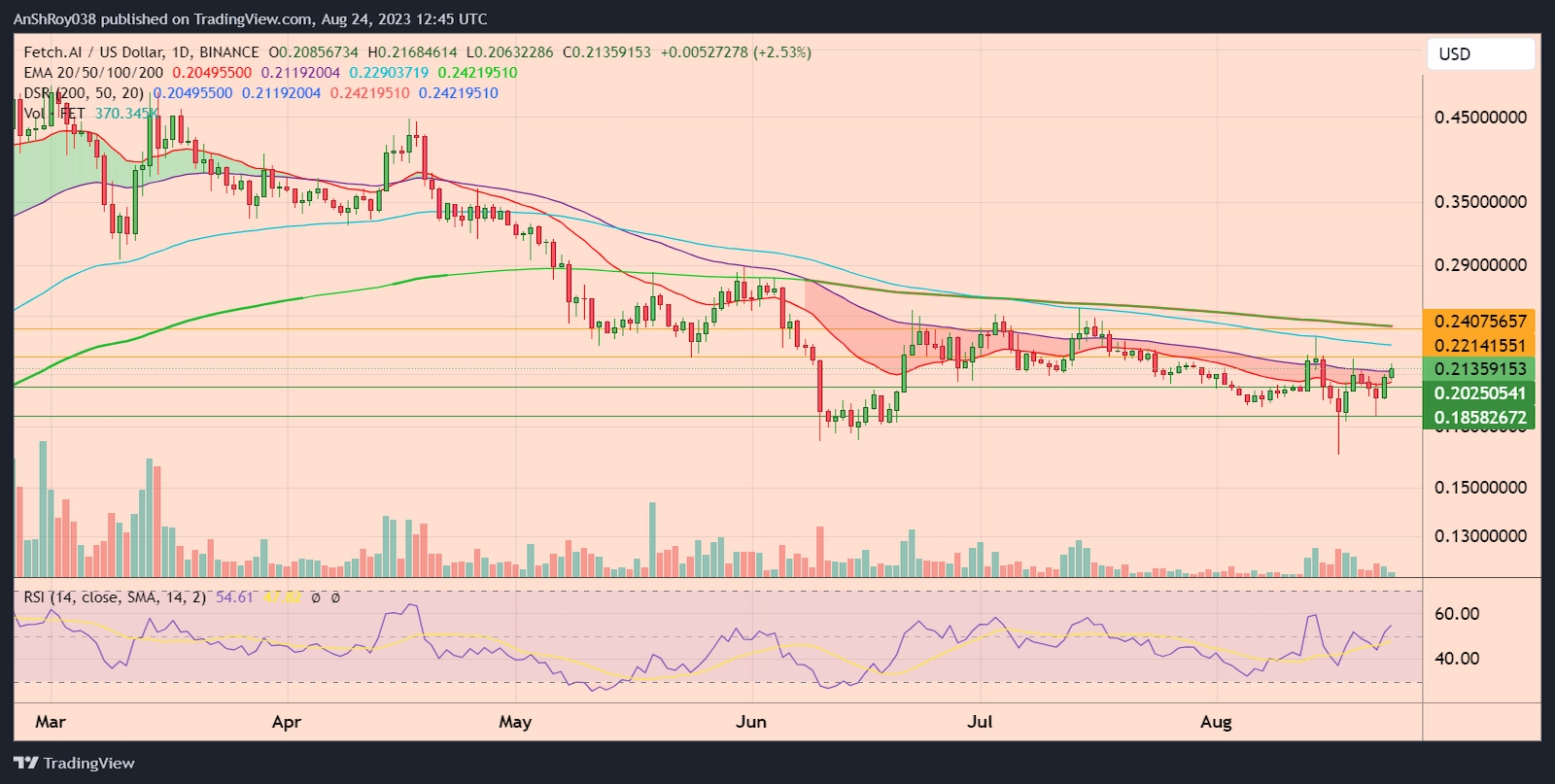 However, the token’s 50-day EMA (purple wave) rebuffed FET’s coin price rally, forcing it to pare some gains after spiking nearly 5.1% to form a daily high near $0.217 on Aug 24. The crypto AI token price would need to conquer the 50-day EMA trendline to infuse confidence in its price action,