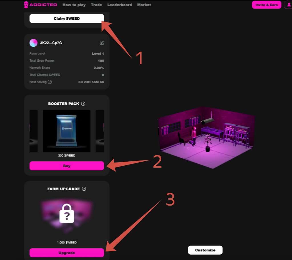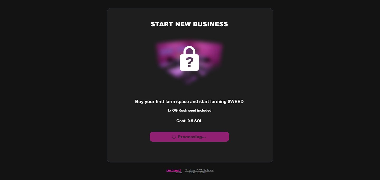 To start farming, players purchase their first farm room for 0.5 SOL, which activates passive $WEED rewards. From there, farms can be expanded with upgrades, new strains, or assets from the in-game marketplace.