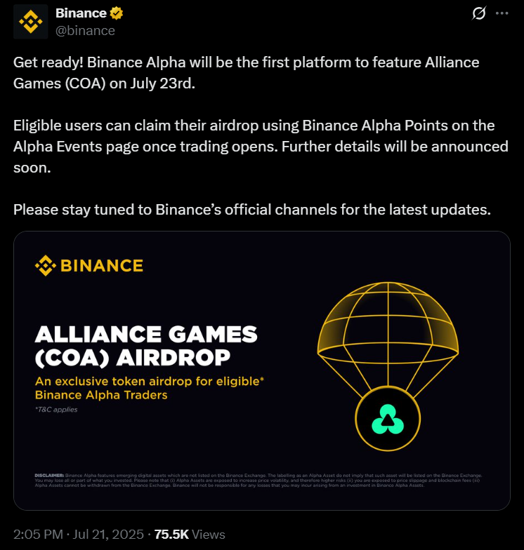 Binance Alpha will officially list Alliance Games (COA) on July 23, making it the first platform to offer this decentralized gaming token. Eligible users will be able to claim their airdrop through Binance Alpha Points on the Alpha Events page as soon as trading opens. Binance has confirmed that more details regarding the airdrop will be shared through its official channels in the coming days.