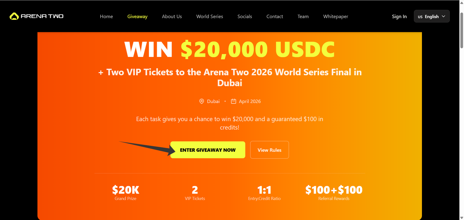 You can win $20,000 USDC and two VIP tickets to the Arena Two 2026 World Series Final in Dubai. All participants also receive Arena Two Credits for use in the app.