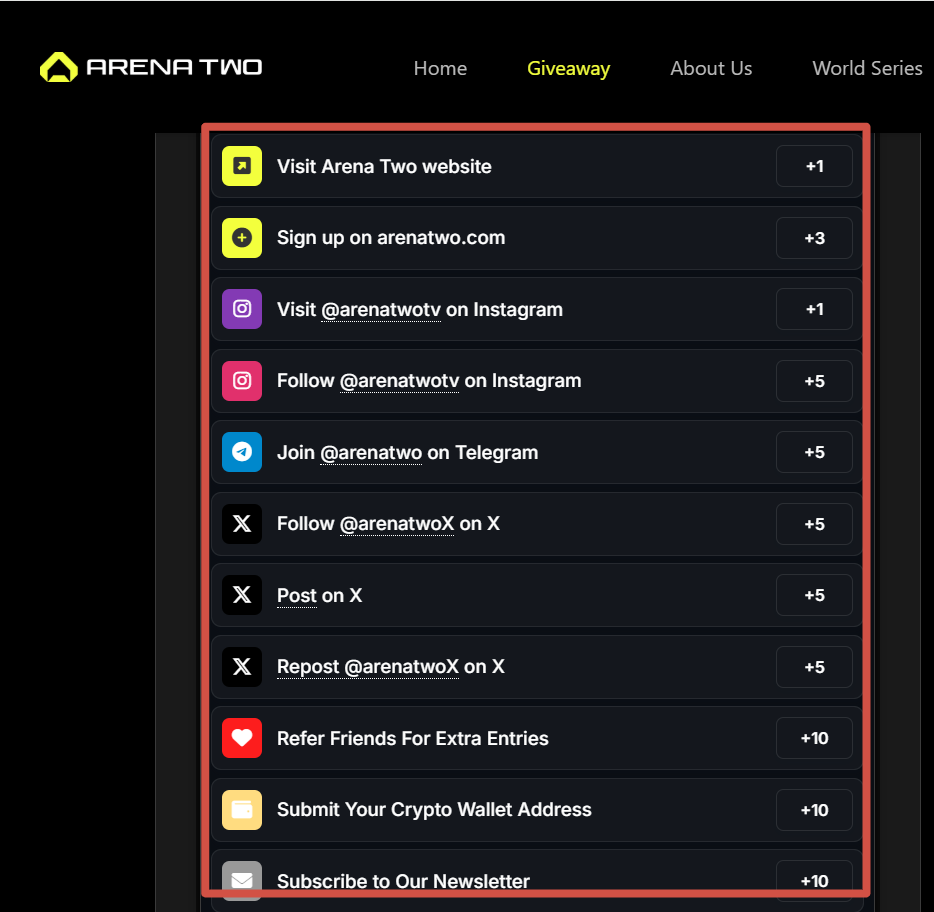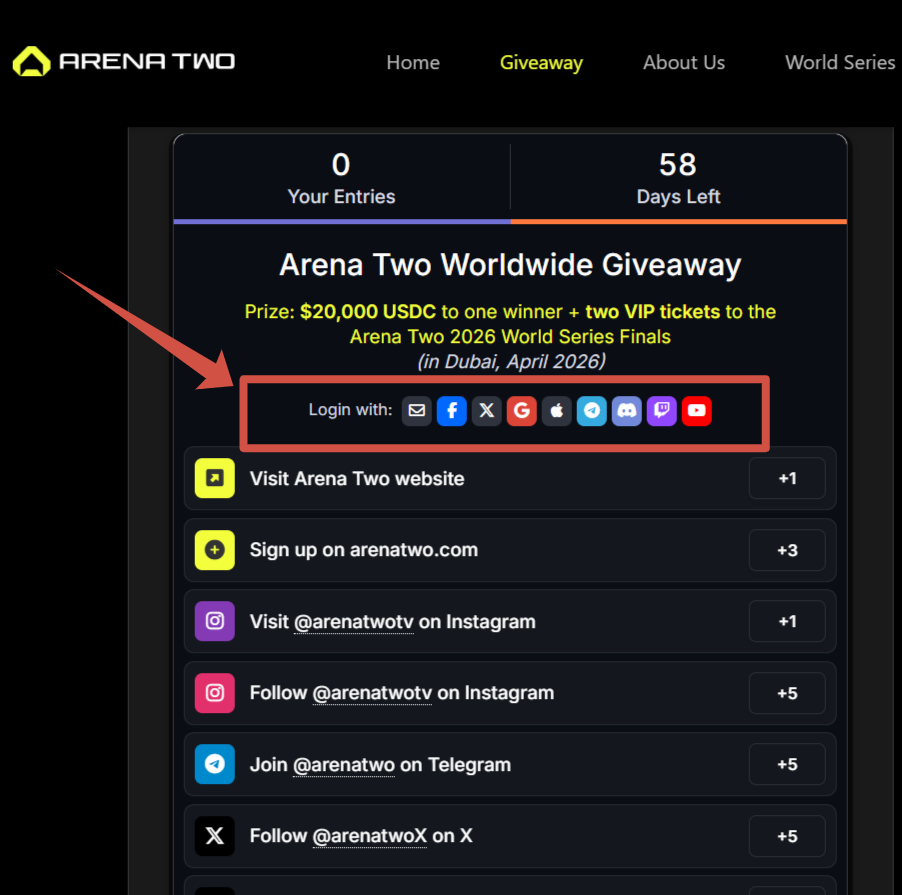 Create an Arena Two account, visit the giveaway page, and complete tasks in the entry widget. Each task provides entries toward the prize draw.