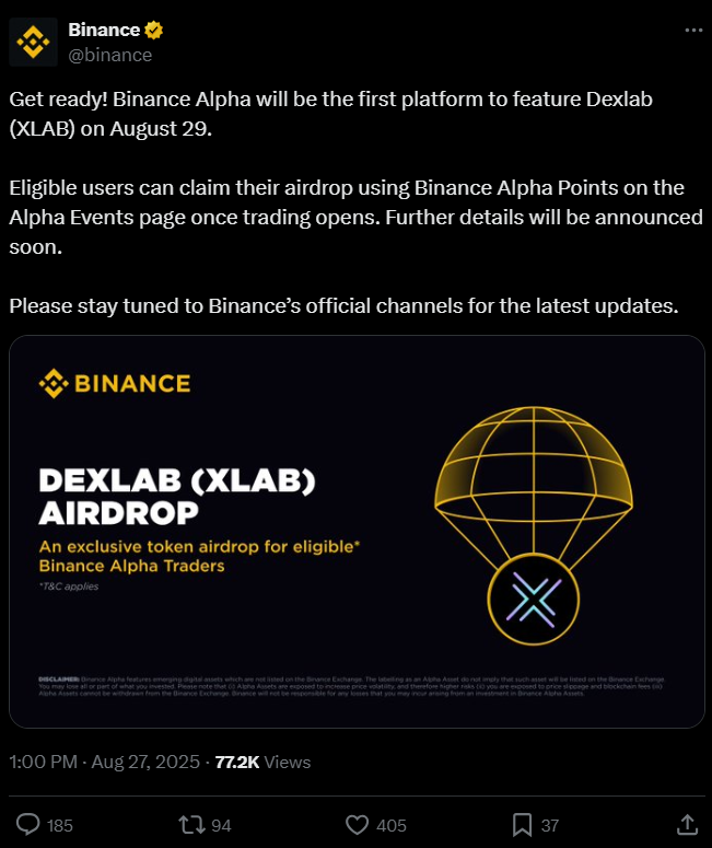 Binance Alpha will start the Dexlab Airdrop on August 29, 2025.