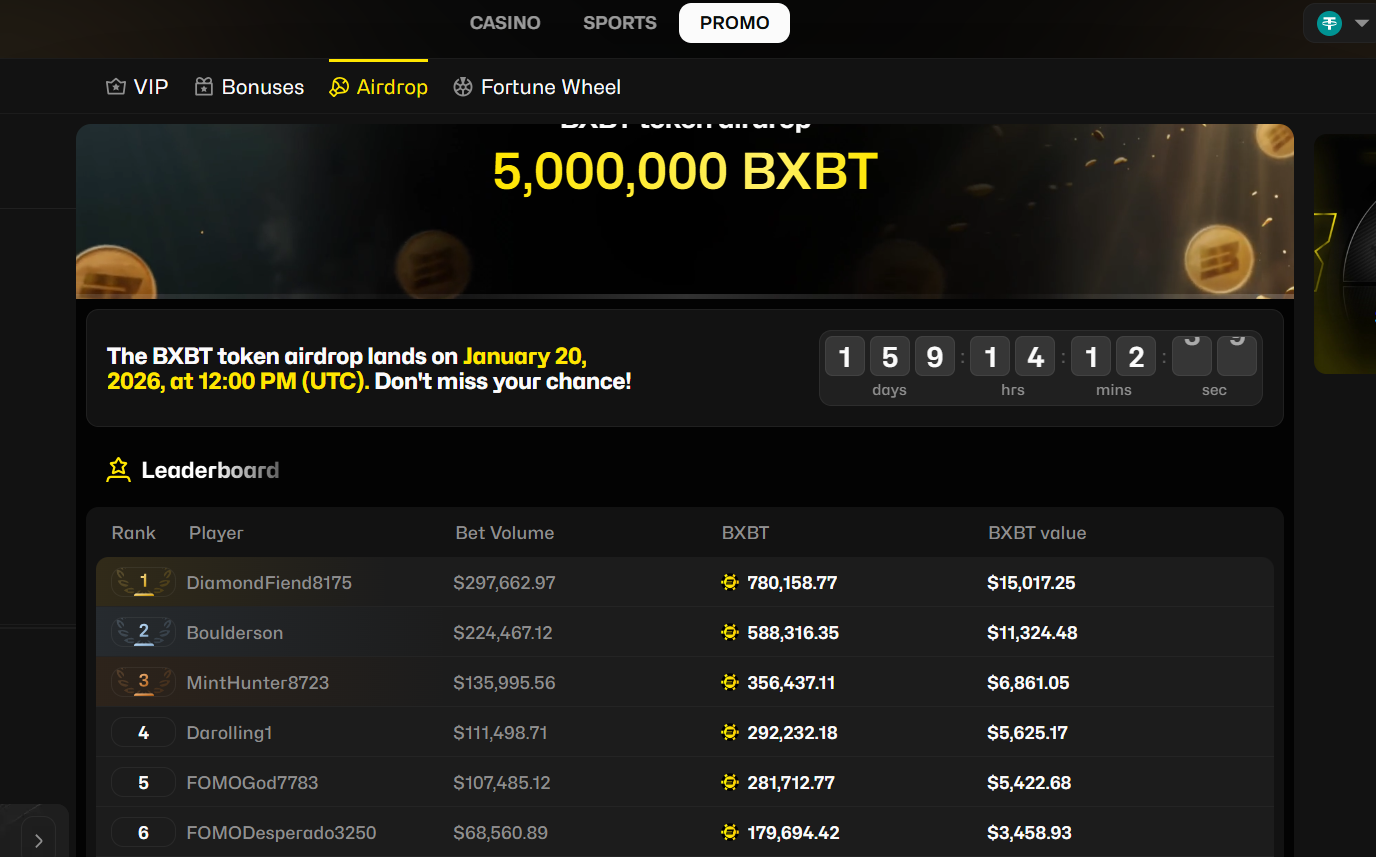 The Boxbet airdrop will distribute 5,000,000 BXBT tokens to participants based on total betting volumes. Only casino slot wagers count toward the leaderboard. The leaderboard updates in real time, and the final snapshot determines each user’s share of tokens.