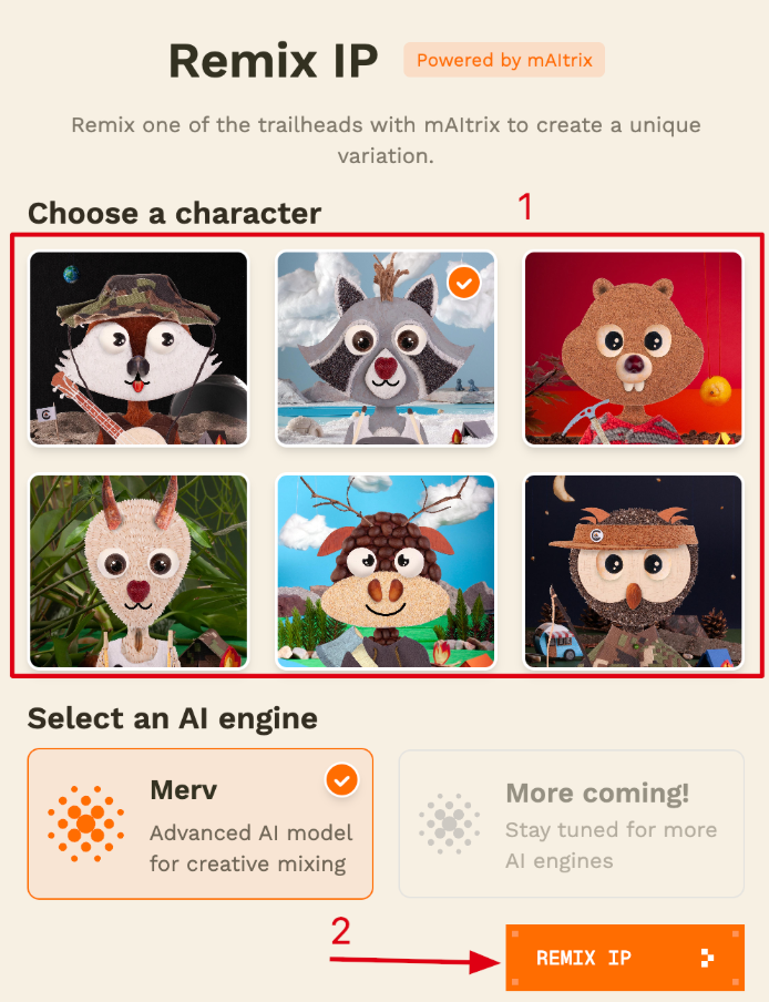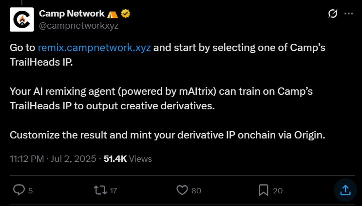 A new creative activity on the testnet allows users to mint 1 of 6 unique characters via Camp’s Remix interface and post their design on X . The best remixes will be selected for an allowlist to Phase 2 of the TrailHeads drop.