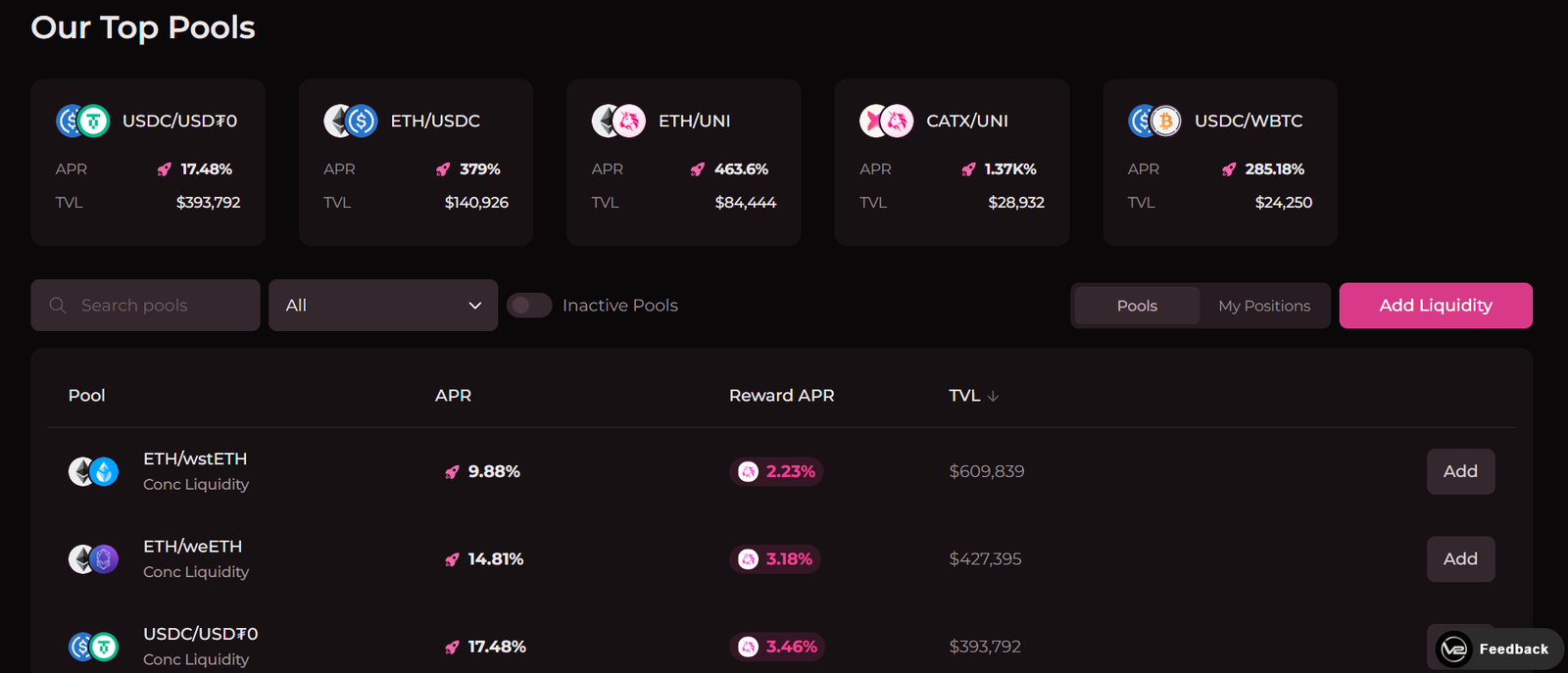 Provide liquidity to active pools on Catex.