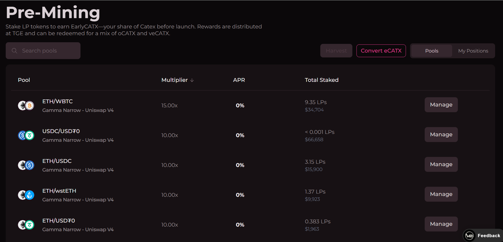 Participate in pre-mining to earn EarlyCATX, which later converts to veCATX and oCATX.