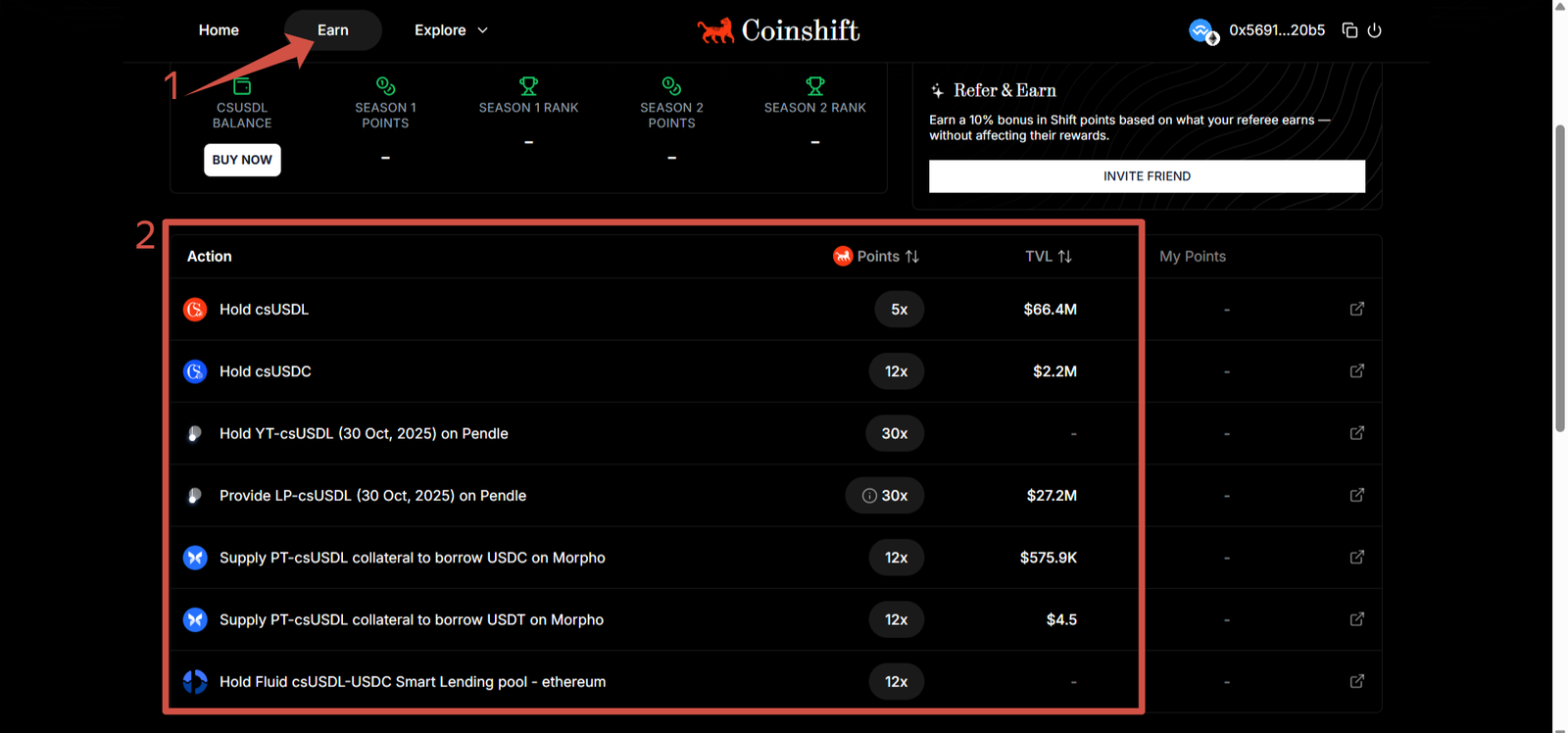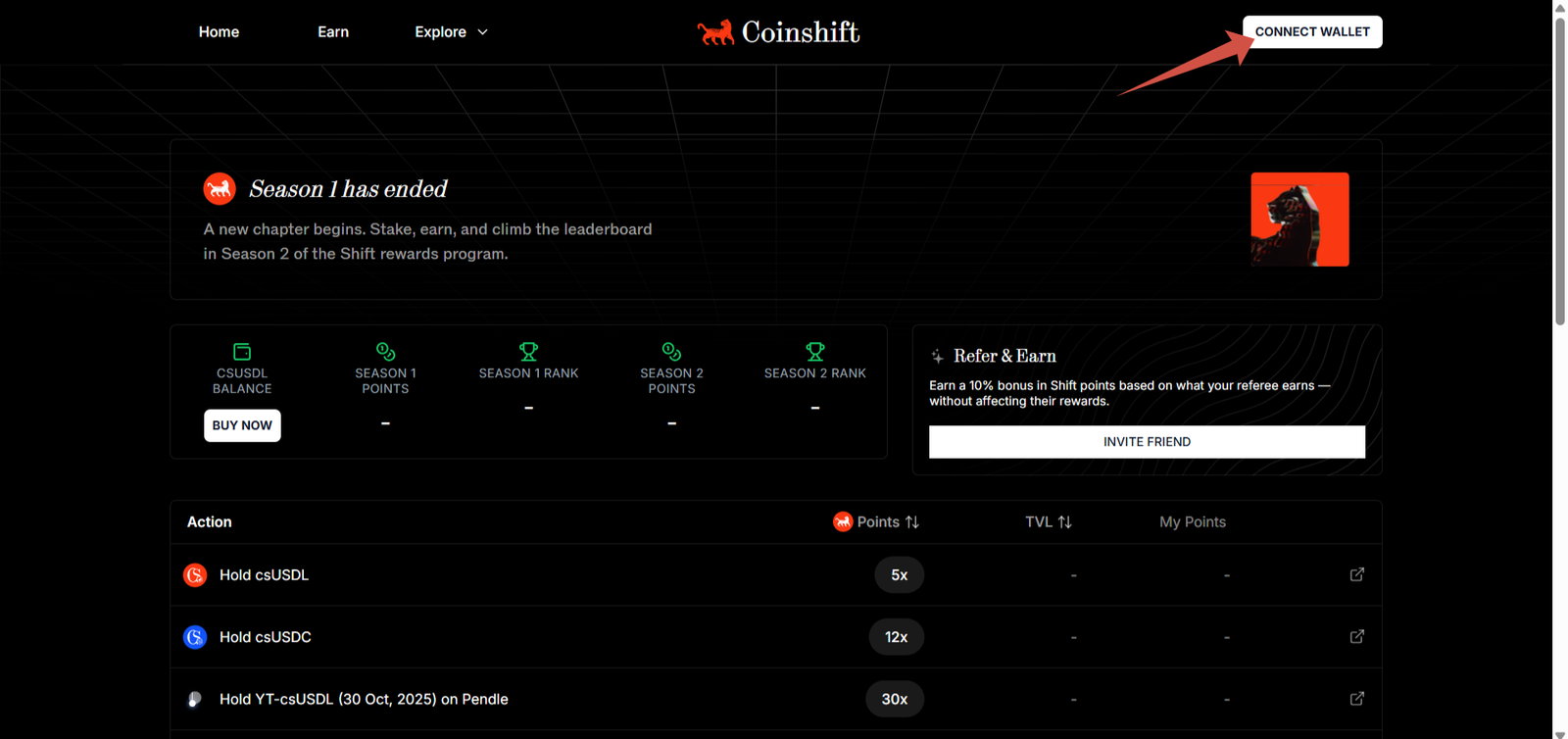 Season 2 of the Coinshift airdrop builds on the first campaign’s success, with 5% of the total $SHIFT supply reserved for participants. Users earn points, known as XP, by holding csUSDL or csUSDC, providing liquidity in partner protocols, completing social tasks, and inviting friends. Multipliers vary depending on activity: holding csUSDL earns 5x points, while participating in Pendle markets can reach 30x.
