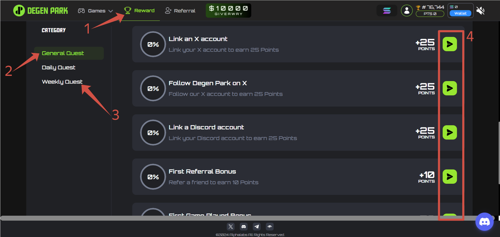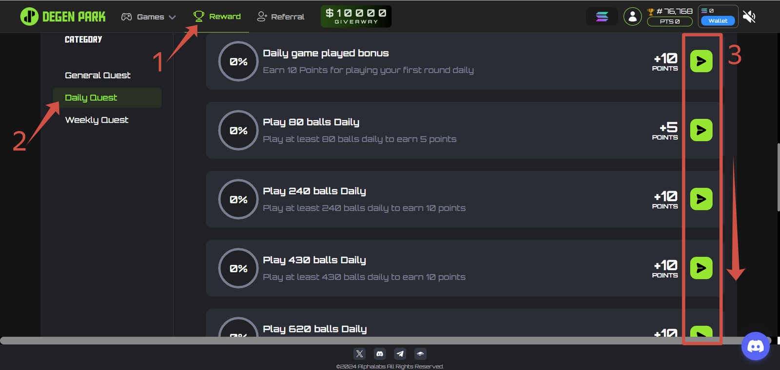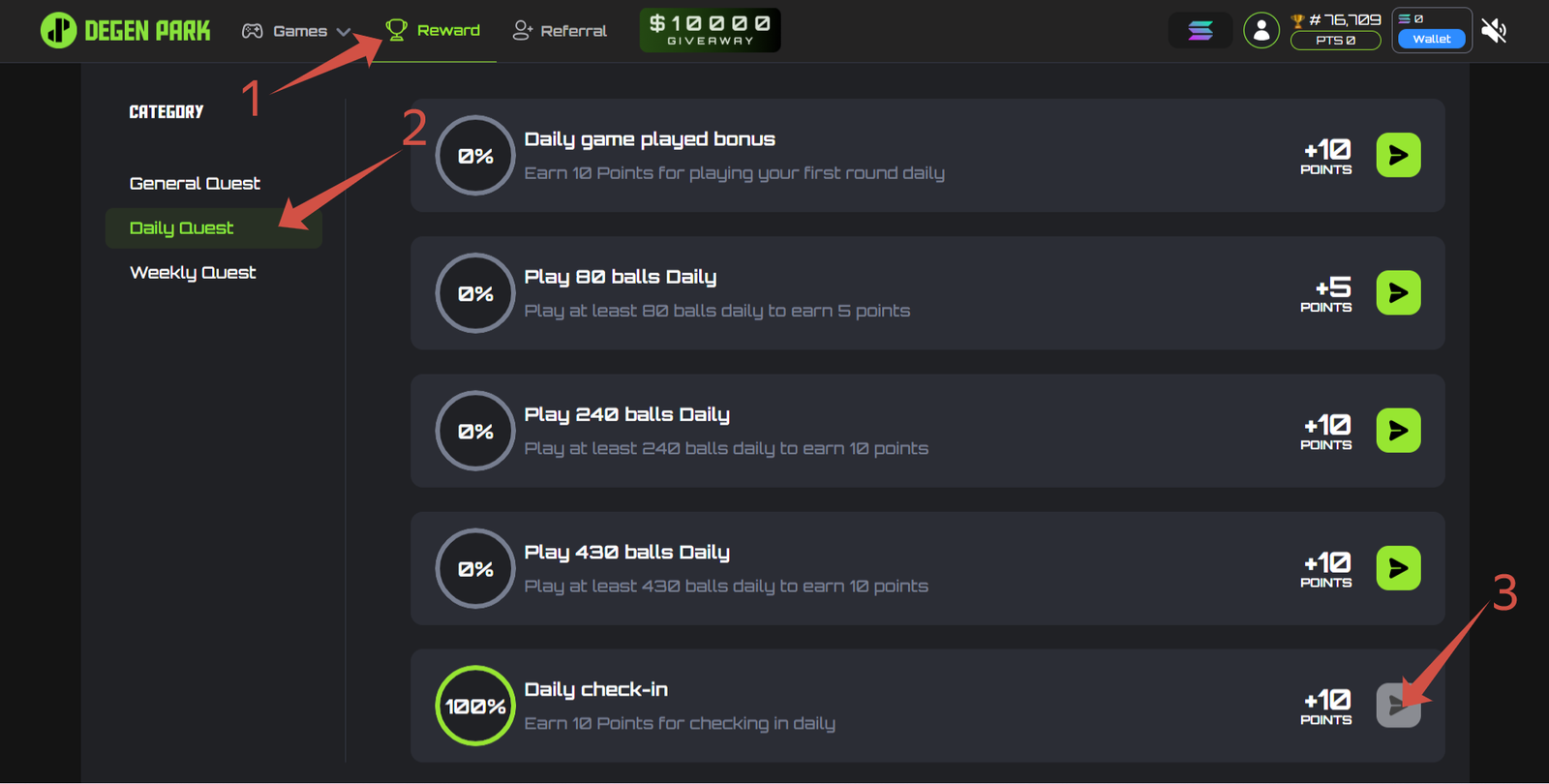 You earn Degen Points by playing games, completing ecosystem tasks, inviting friends, and joining quests. The system also gives you extra points for hitting milestones, which determine your share of $DPARK tokens at TGE.