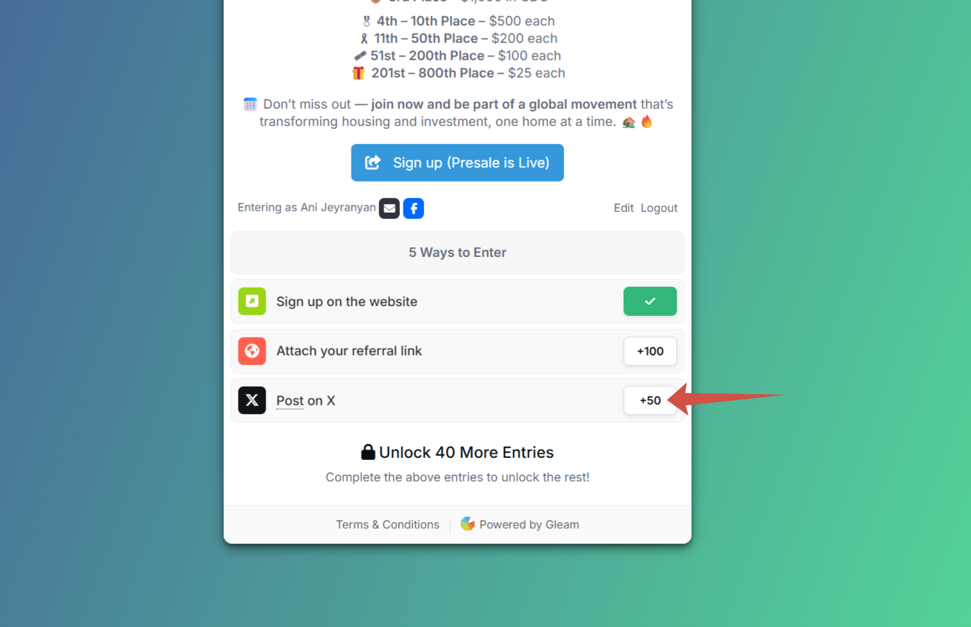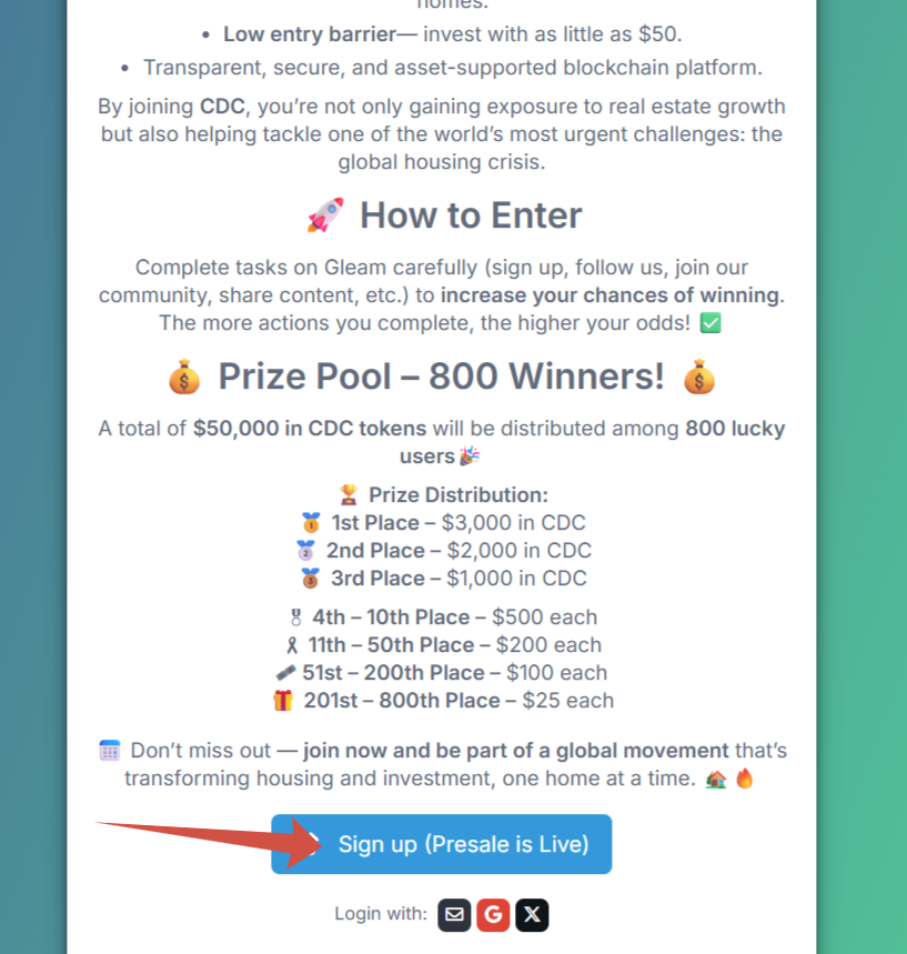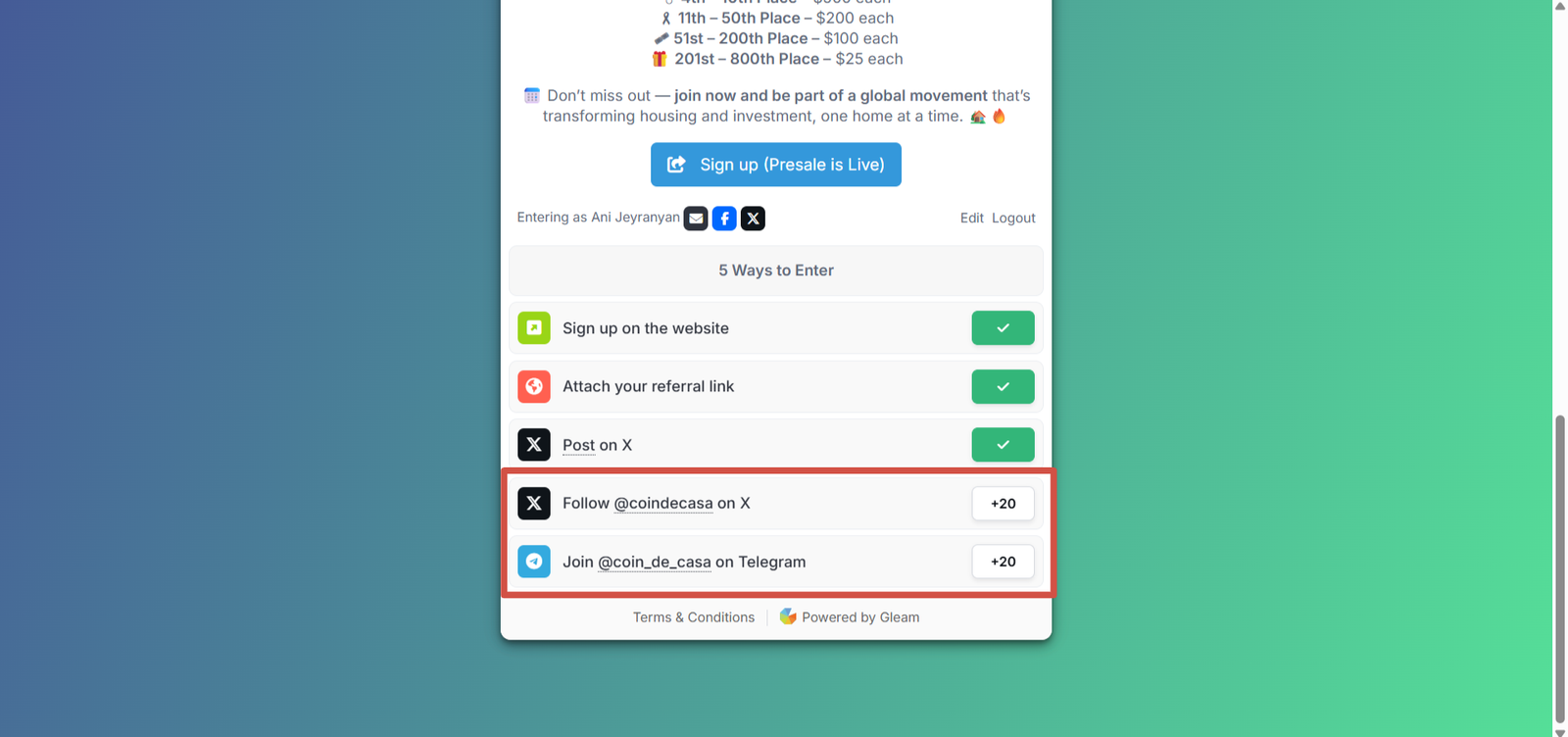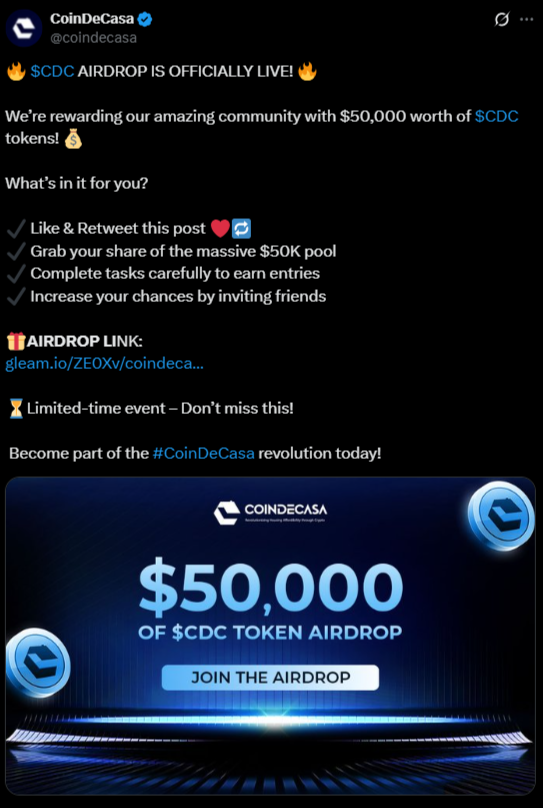 Anyone who completes the required tasks on the Gleam platform, including signing up, following Coin De Casa on social media, joining the community, and sharing content, is eligible.