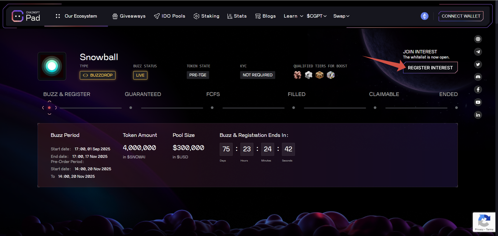 1. Visit the Campaign Page: Open the Snowball Buzzdrop page on ChainGPT Pad, connect your wallet and complete KYC verification to start participating.
