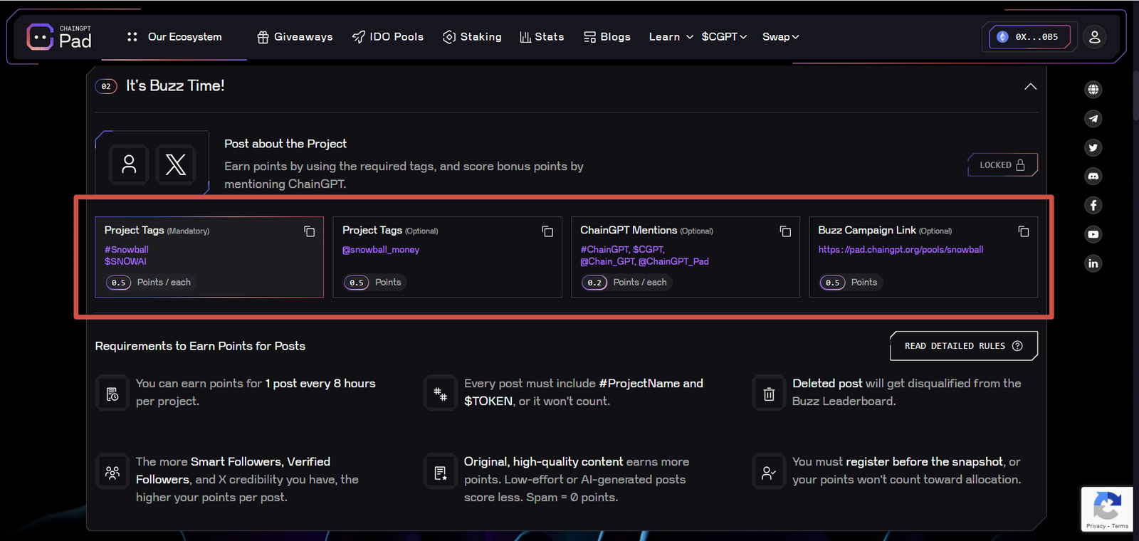 3. Post About the Project: Use the required hashtags (#Snowball and $SNOWAI) to earn points. Mention ChainGPT tags for extra points.