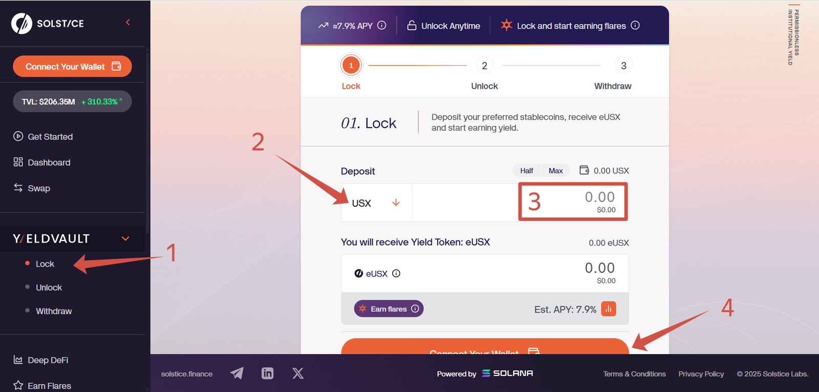 - eUSX — a yield-bearing version of USX generated through YieldVault, Solstice’s native earning platform.