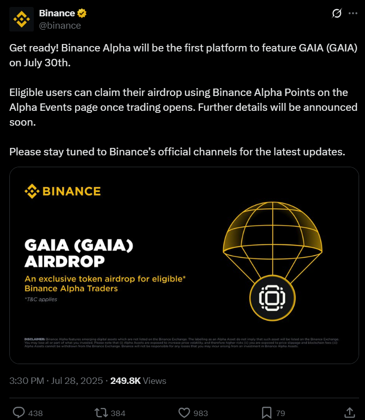 Binance has announced that Gaia (GAIA) will officially launch on Binance Alpha on July 30. This marks the first listing of the GAIA token, and it comes with an airdrop opportunity for eligible users. According to a post shared on Binance’s X account, users will be able to redeem GAIA tokens using their Binance Alpha Points once trading opens.