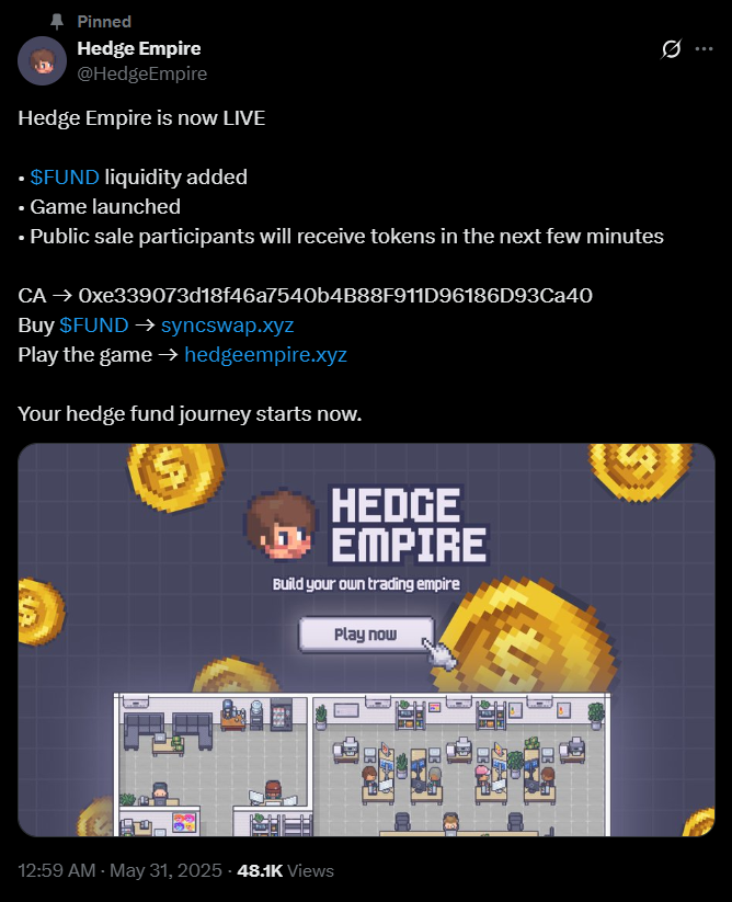 Hedge Empire is an onchain idle game built on the Sophon network. It has rolled out the Hedge Empire Airdrop program, enabling participants to earn $FUND tokens through strategic gameplay, liquidity provision, and referrals. The project merges decentralized finance concepts with virtual hedge fund management.