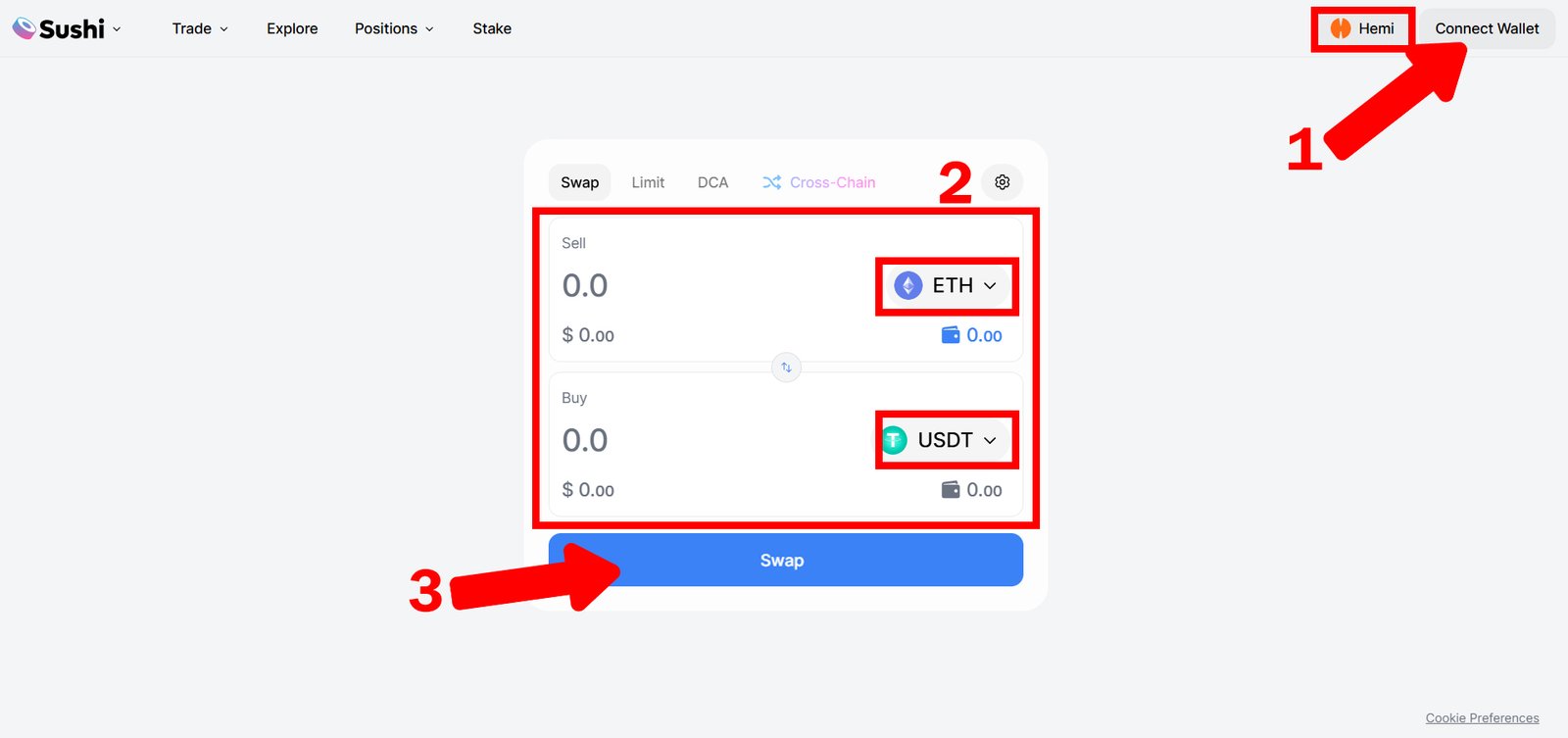 2. Swap ETH or BTC for USDT, USDC, or BTC on Sushi