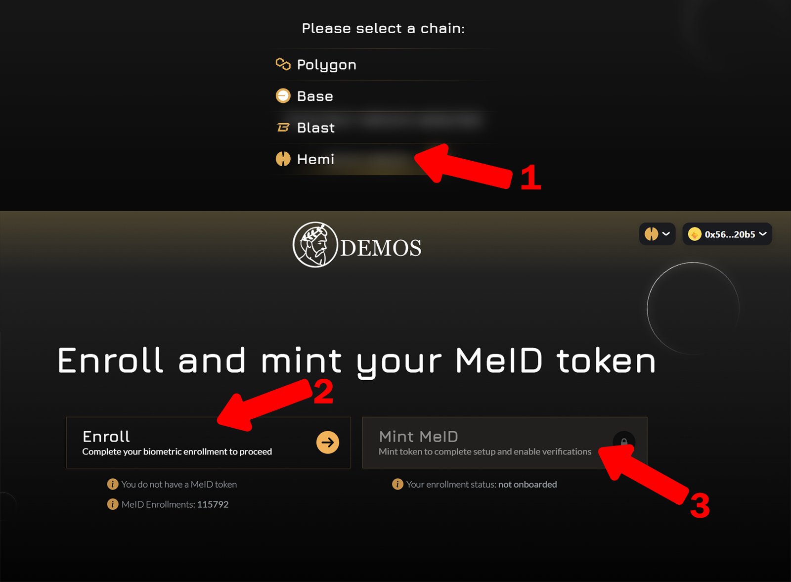 2. Connect your wallet, verify with Demos (https://app.demos.global/dashboard/hemi), and mint the badge
