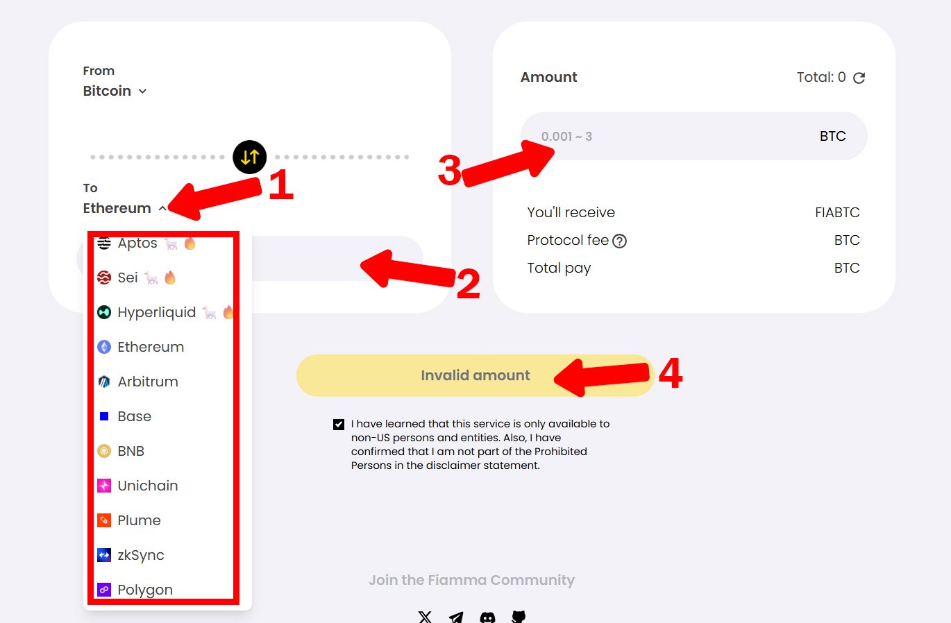 Ensure you have BTC for minting FIABTC. Acquire SEI tokens for Sei Network activities and APT tokens for Aptos via exchanges or cross-chain bridges.