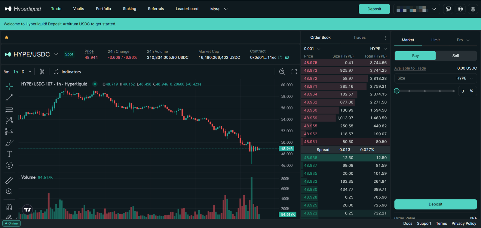 1. Get USDC on Hyperliquid. (https://app.hyperliquid.xyz/trade)