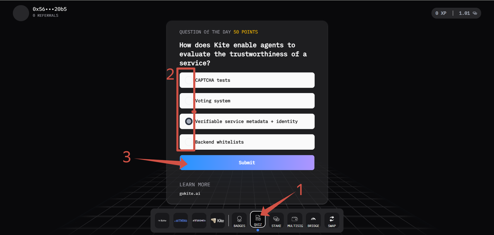 1. Connect a wallet on the KITE AI website (reuse the same wallet if you joined V1) and answer the questions.