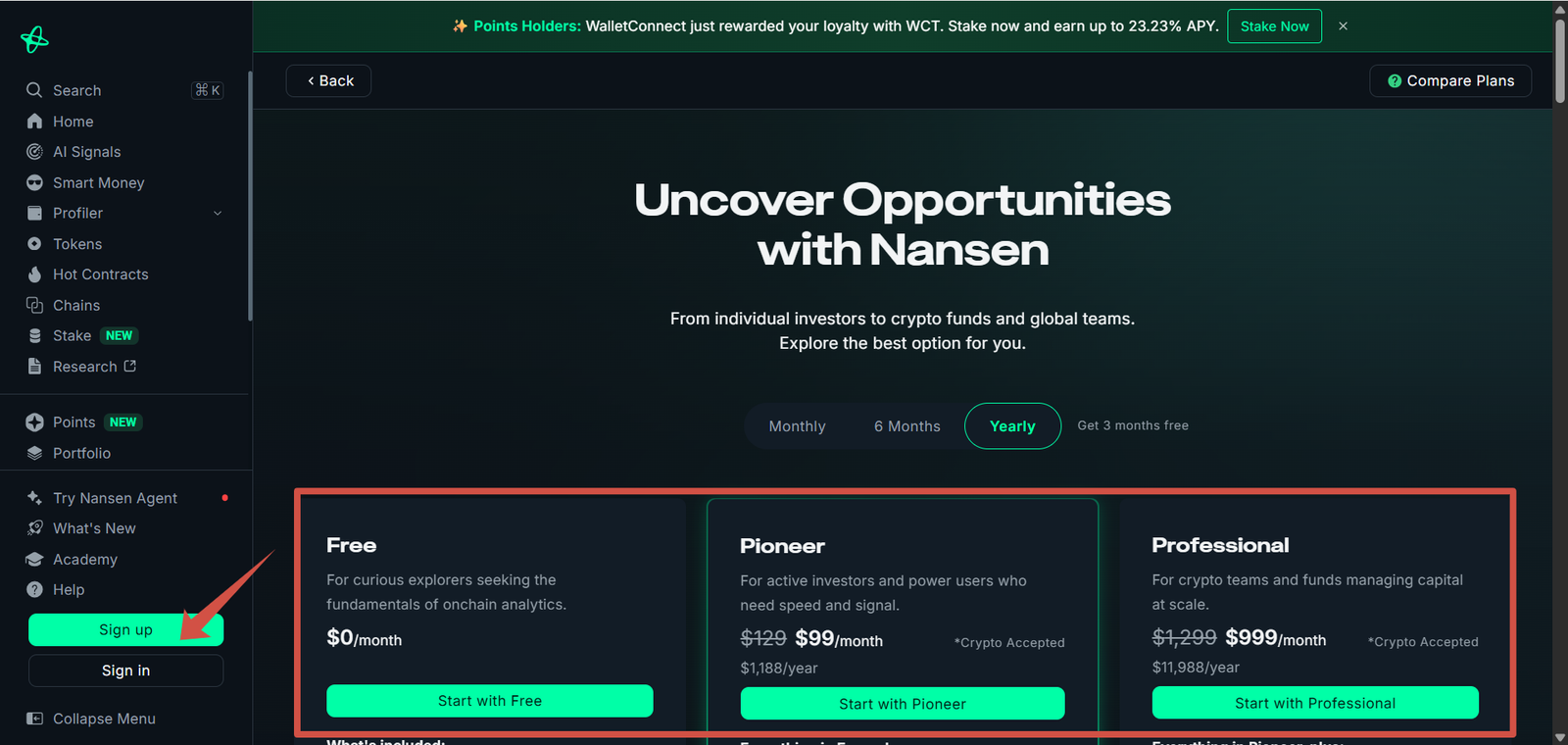 1. Visit the Nansen website, select a subscription plan 10 NXP per $1 spent on subscription, and connect your wallet.