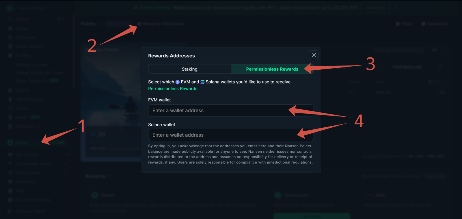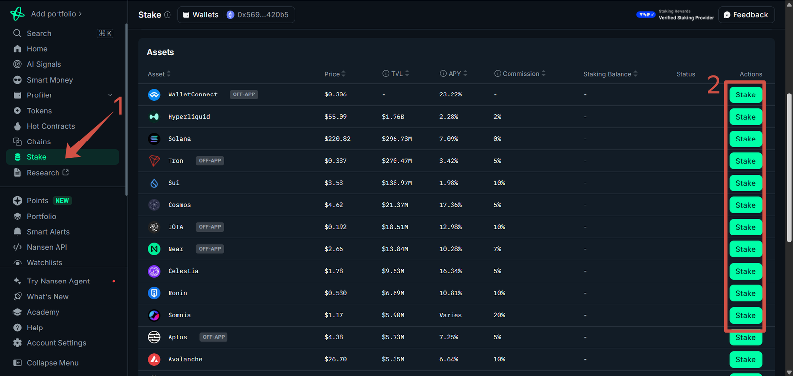 3. Buy supported tokens, move them to your wallet, connect to Nansen’s staking dashboard, and stake your assets. Earn NXP weekly by staking over $1,000 for 900 points, unlock a 2x boost at $20,000, and a 3x boost at $100,000.
