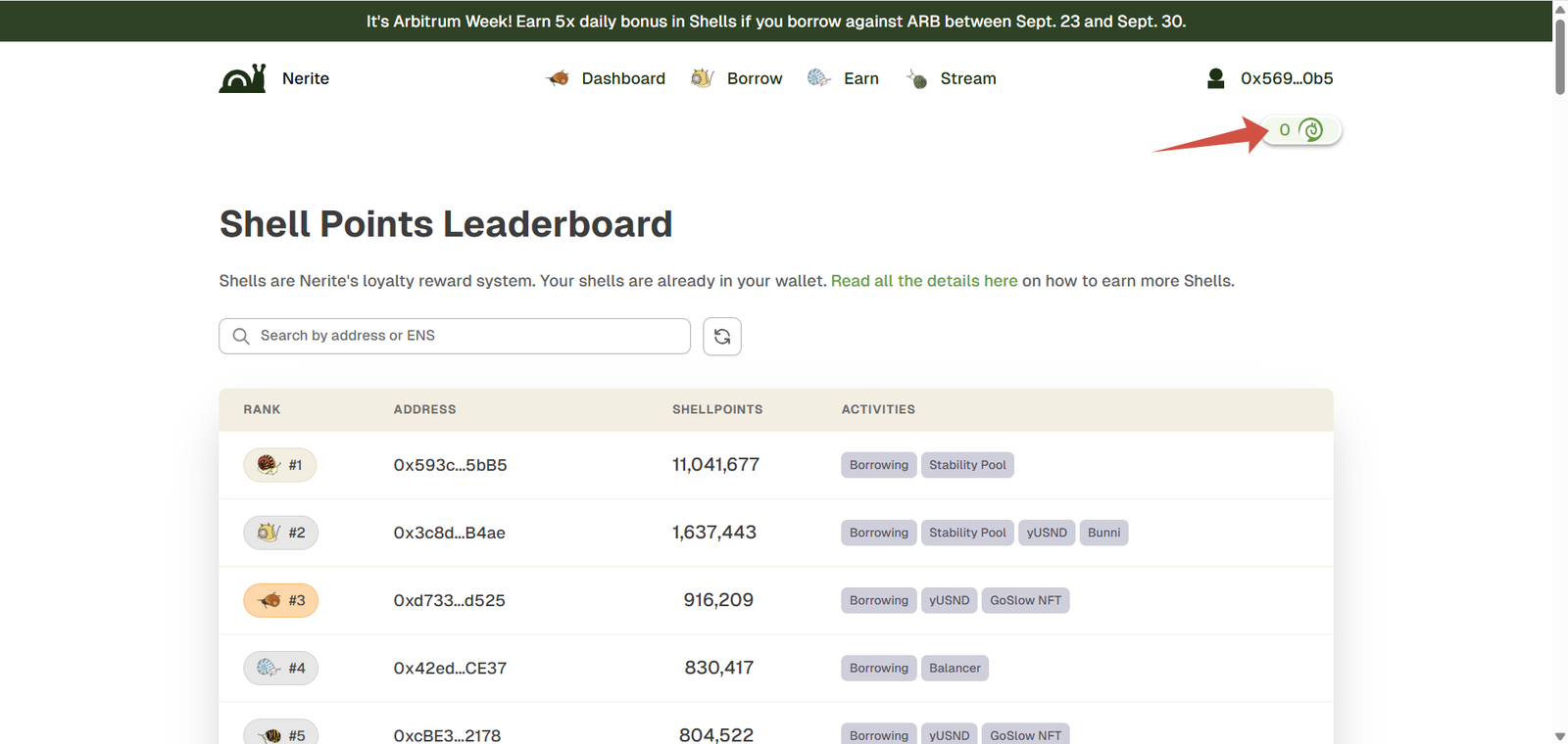 Shell Points are Nerite’s loyalty rewards, distributed as real tokens on Arbitrum. The system releases one million Shells every day, sending them directly to user wallets. No registration, claiming, or extra steps required. Users automatically earn points by borrowing, depositing, or providing liquidity with USND.