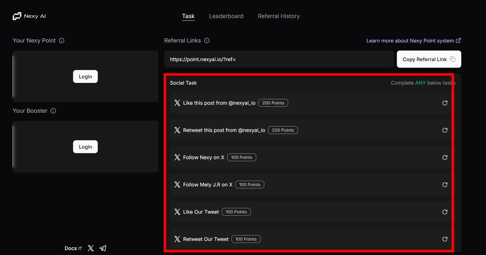 • Update Your Profile: Add “nexyai.io” to your bio or username for 150 points. It may also help bring in more referrals.