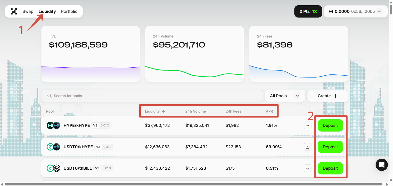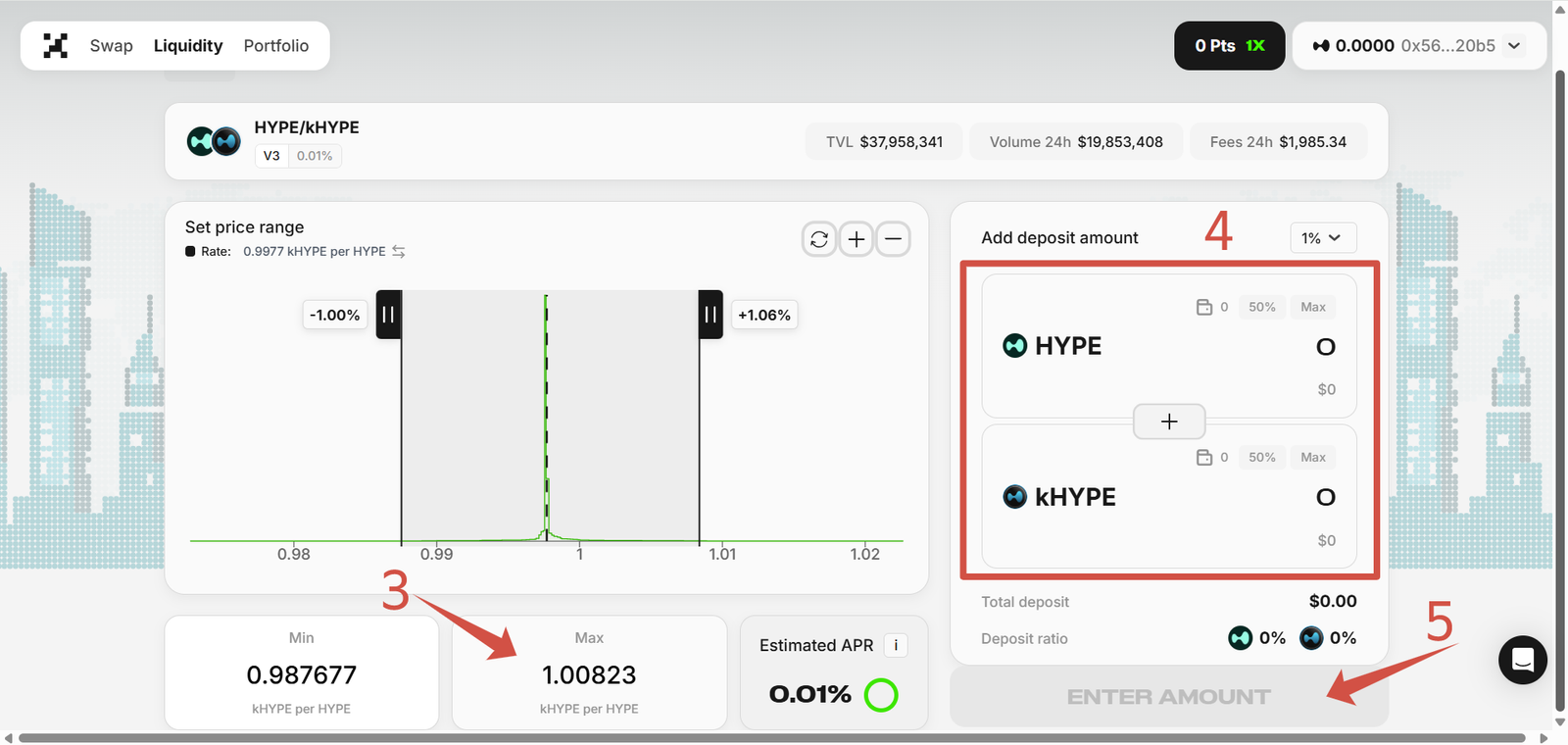 4.Provide Liquidity: Add a liquidity pool (for example HYPE and kHYPE). Choose a price range for your position—your funds stay active as long as the token trades within it. Returns depend on pool volume, your share of deposits, and APR. Stable ranges offer safer but smaller rewards, while higher-volatility pairs can earn more points and fees.