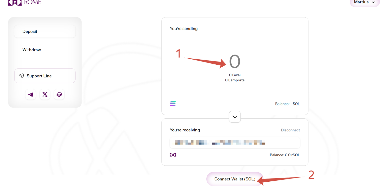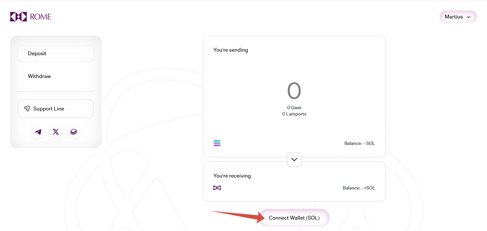 1. Go to the Rome website and connect your Solana and EVM wallets.