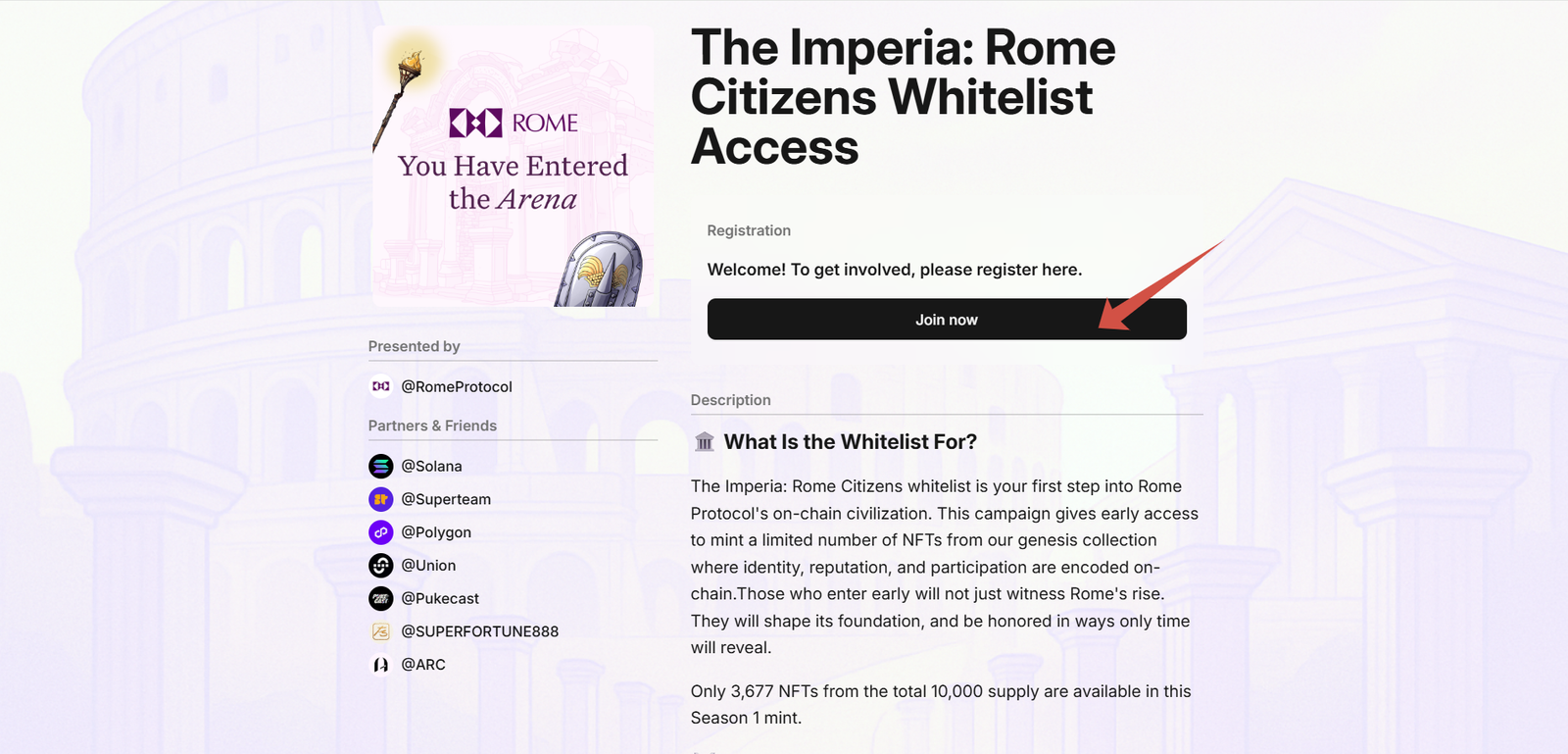 Imperia NFTs act as entry passes to quests, campaigns, and governance. Holding one signals active participation and may influence eligibility for a future Rome Protocol token distribution.