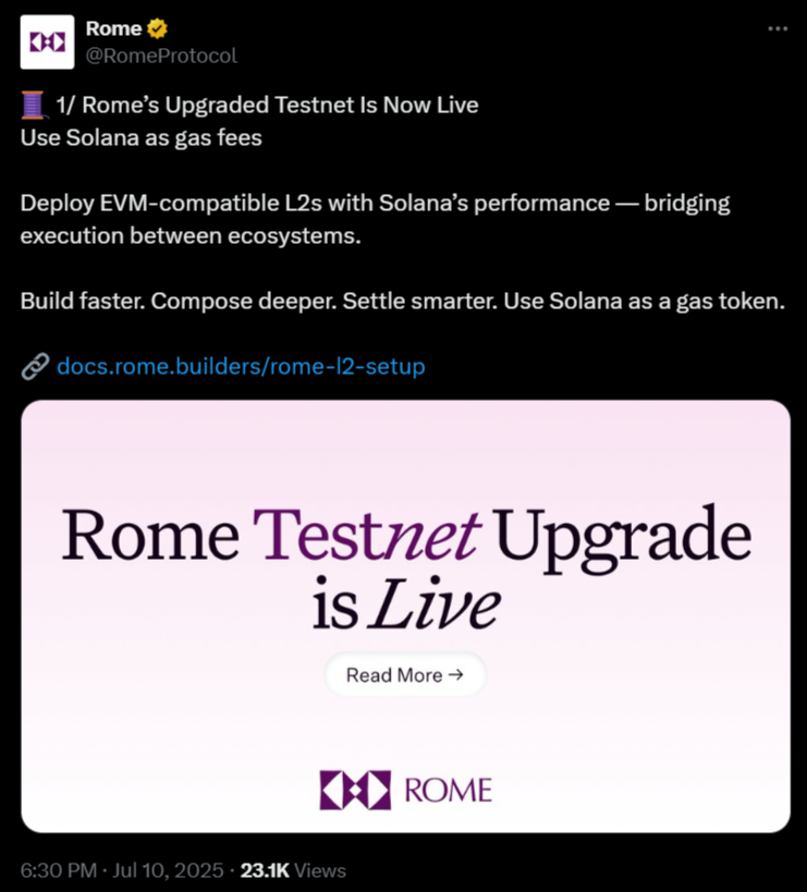 Rome Protocol, built on Solana, develops infrastructure to connect blockchains such as Ethereum and Bitcoin into a unified system. It focuses on high-speed, low-cost transactions and uses the metaphor of ancient Rome to describe itself as the “roads and markets” of the onchain economy.