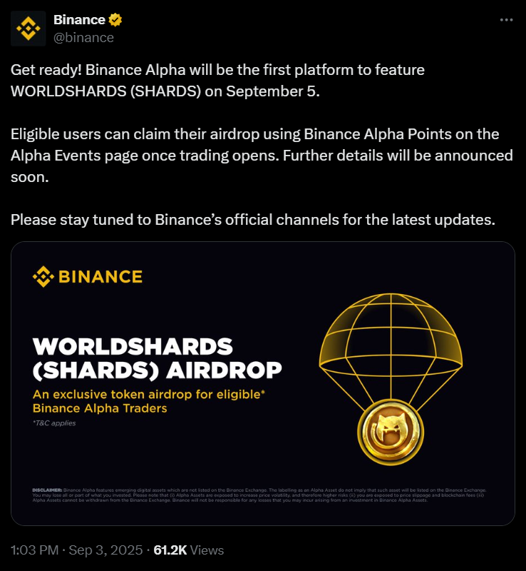 The WorldShards Airdrop launches on Binance Alpha, with WORLDSHARDS (SHARDS) trading starting on Sept. 5, 2025. Eligible users can claim their airdrop using Alpha Points, earned by completing tasks on Binance Alpha. Users will redeem the airdrop through the Alpha Events page once trading begins.