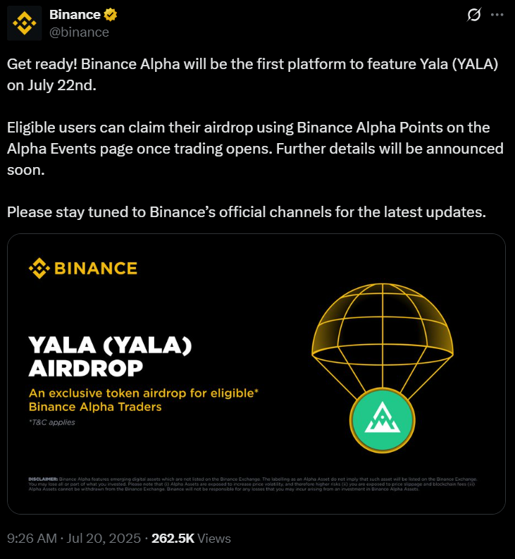 Binance Alpha will list Yala (YALA) on July 22, 2025, and open airdrop claims for eligible users holding Alpha Points. According to a post on X, users can redeem their YALA airdrop through the Alpha Events page once trading begins. Binance urged participants to check its official channels for detailed claim instructions. The launch follows Yala’s first airdrop season and marks a new phase in the project’s development, especially as it moves toward broader DeFi adoption.
