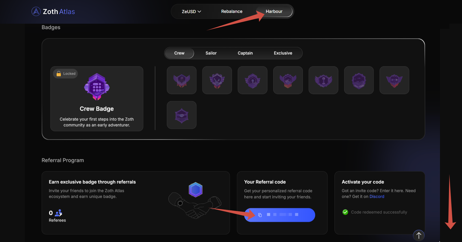 4. Open the Harbour tab to invite friends, complete social tasks, and collect badges.