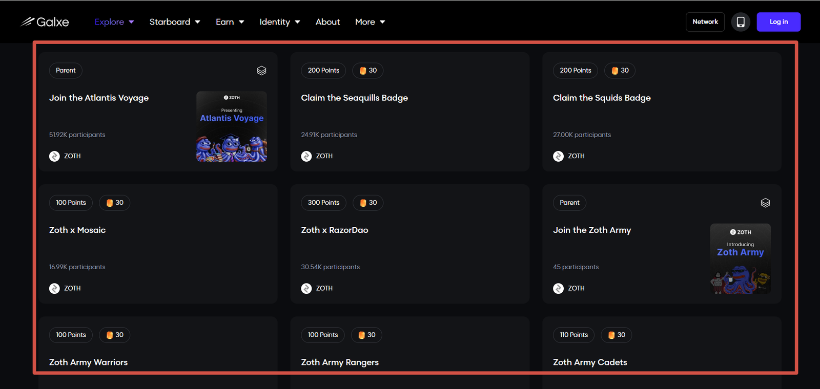 Users qualify by interacting with Zoth Atlas features like Mint, Rebalance, Compass, and Harbour, and by completing tasks on Galxe.