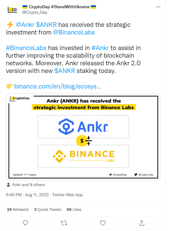 Binance makes a “strategic investment” in Ankr Network.