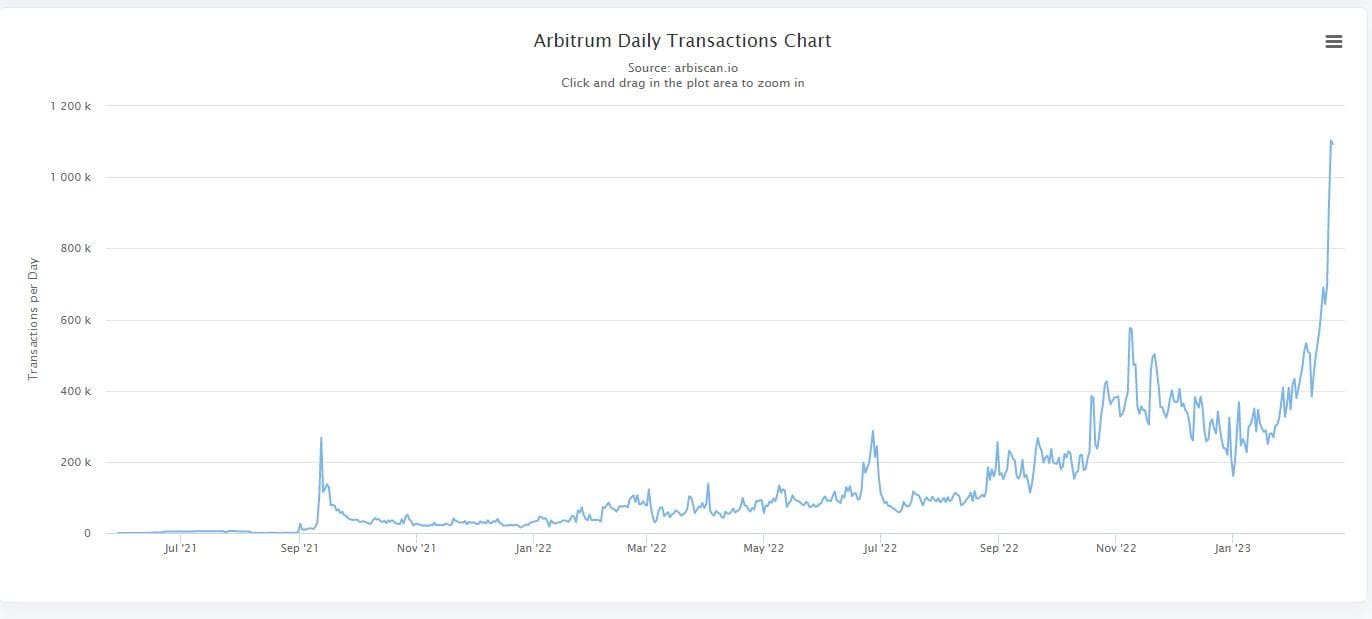 The number of daily transactions on the Arbitrum Network jumped from almost 160,000 on Jan 1 to over 1.1 million on Feb 21, constituting a roughly 590% increase year-to-date, according to block explorer Arbiscan, and an all-time high for the Network.