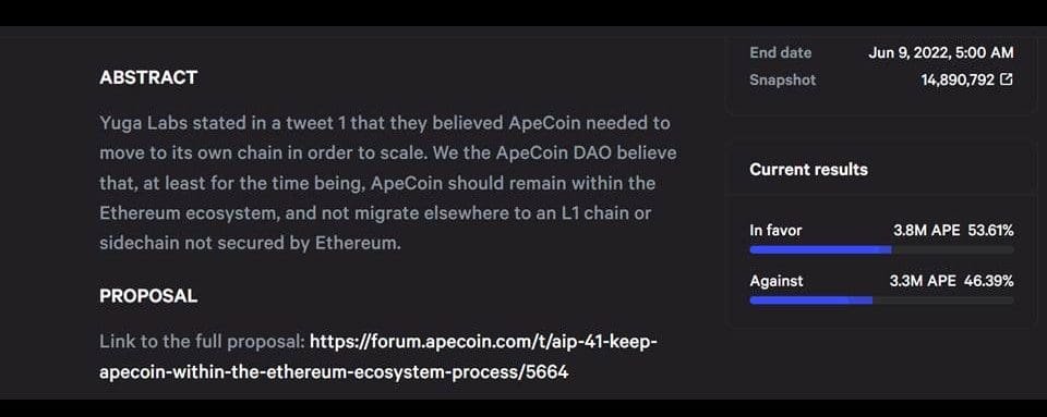 According to data on Snapshot, 53.61% have voted against the proposal so far. In contrast, 46.39% of APE votes have favored migration.
