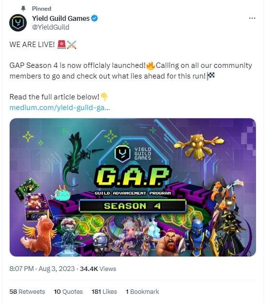 Yield Guild Games announced the launch of the Guild Advancement Program (GAP) season 4.