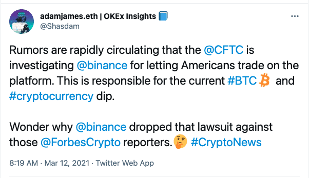 “Rumors are rapidly circulating that the @CFTC is investigating @binance for letting Americans trade on the platform,” tweeted OKEx senior editor Adam James.