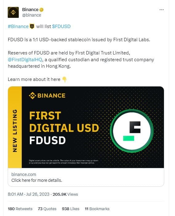YEREVAN (CoinChapter.com) – Binance listed the new stablecoin FDUSD, introduced by Hong Kong-based First Digital Group in early June 2023. The announcement stated that Ethereum and Binance Smart Chain-based stablecoin trading will start at 08 am UTC on July 26.