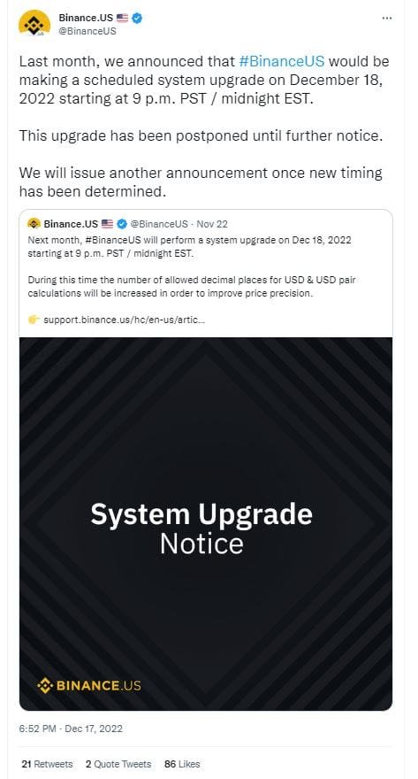 On [Dec 17] Binance.US temporarily halted withdrawals of the Tether stablecoin (USDT). It turned out that Binance.US apparently didn’t have enough USDT in its wallets to pay back customers for several hours. The USDT balance in the main Binance.US wallet dropped to its lowest level ever ($197,000) during this time period.