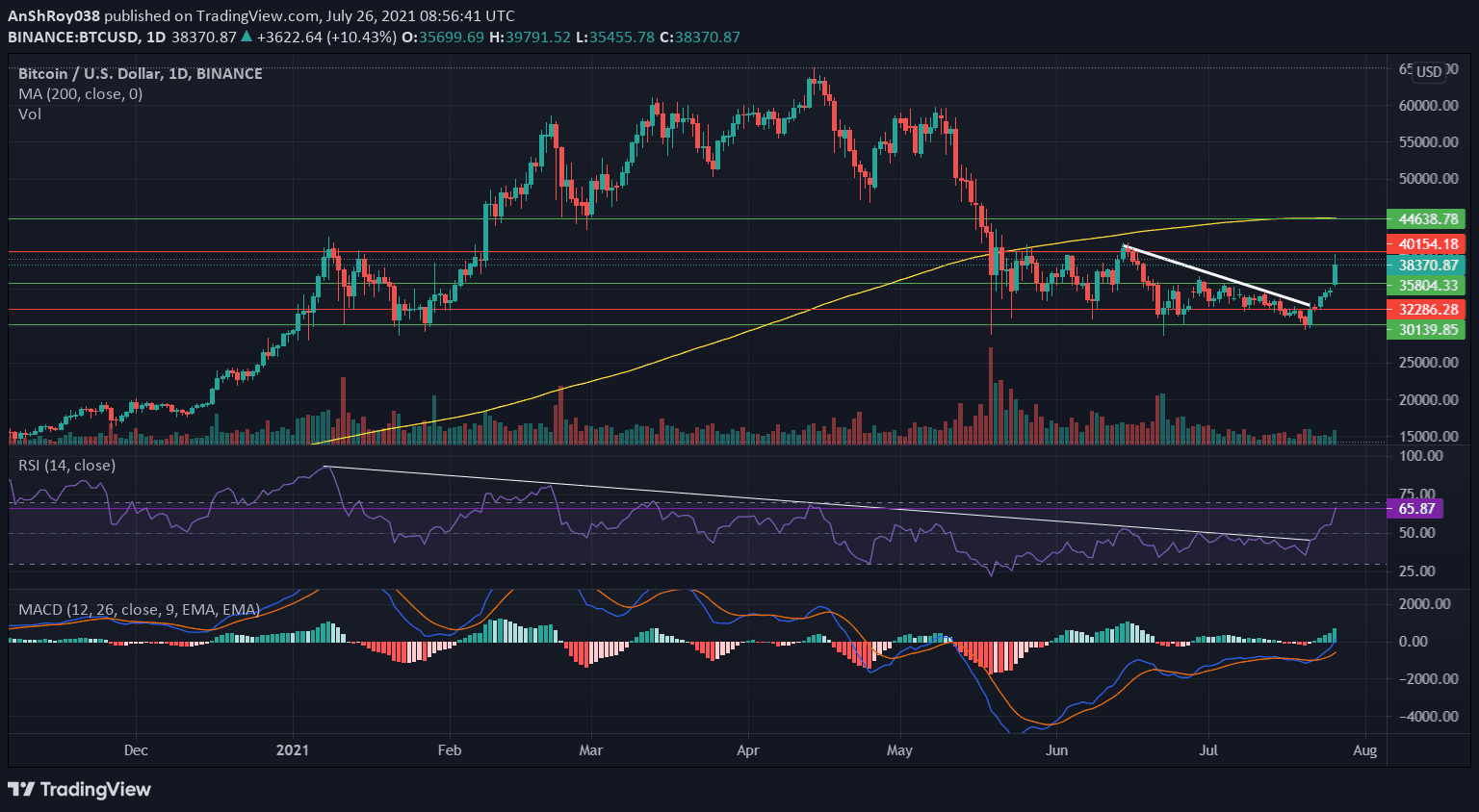 At the time of writing, Bitcoin was trading at $38,475.94, up 10.71% on the day.