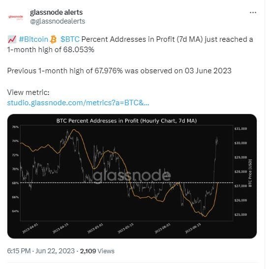 YEREVAN (CoinChapter.com) – Bitcoin rode the altcoin avalanche wave and the growing adoption, ballooning to $30,000 in the European session on June 22 after a weekly 25% rally. However, some metrics point to correction ahead.