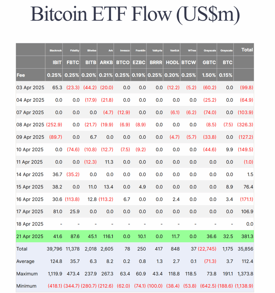 NOIDA (CoinChapter.com) — Bitcoin Exchange-Traded Funds (ETFs) are back in focus after a fresh surge in institutional inflows. On Apr. 21, 2025, US spot Bitcoin ETFs recorded a net inflow of $383 million—their highest single-day inflow since January—according to Bloomberg and Bitwise Europe.